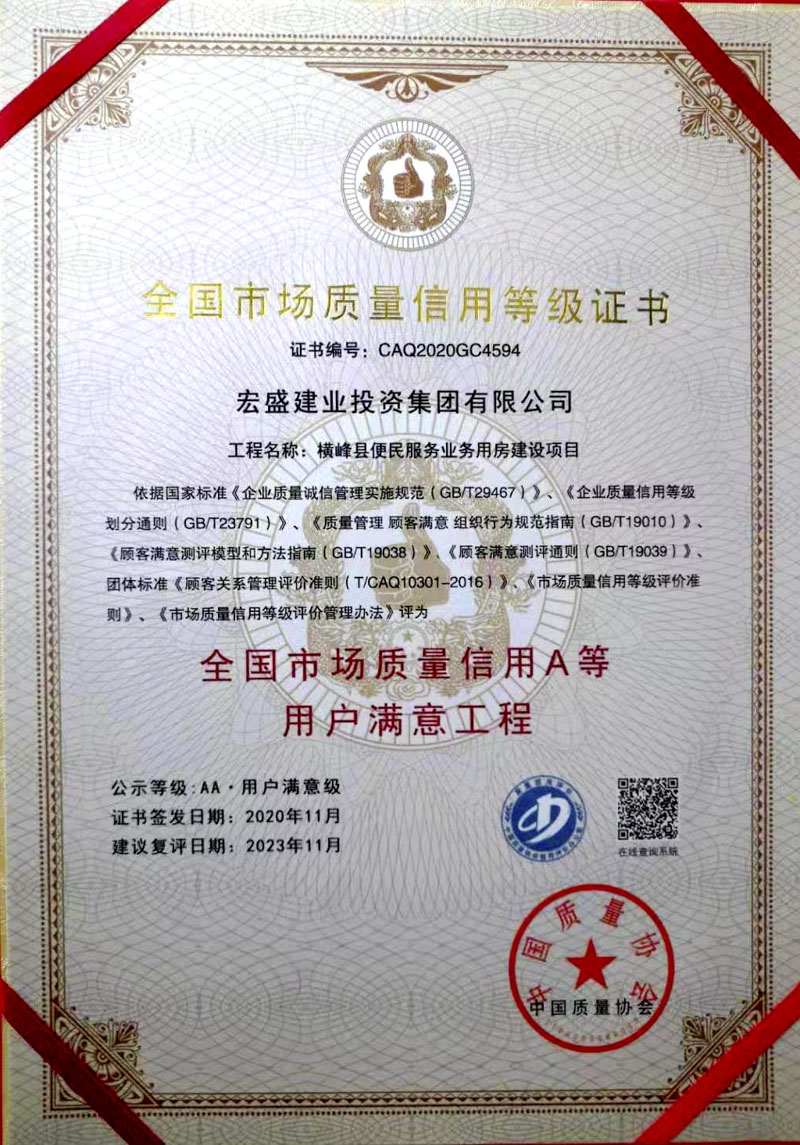 2018年10月-12月參與橫峰縣便民服務(wù)業(yè)務(wù)用房建設(shè)項(xiàng)目,項(xiàng)目獲評全國市場質(zhì)量信用A等 用戶滿意工程