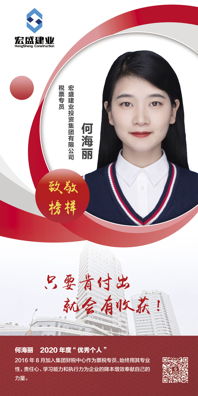 在我們的生活工作中,總有那么一群優(yōu)秀的人,他們始終保持愛崗敬業(yè)、無私奉獻的熱情奮戰(zhàn)在一線,燃燒自己去照亮每一個平凡的崗位。宏盛建業(yè)投資集團2020年度“優(yōu)秀個人”——財稅管理中心何海麗便是其中一位。