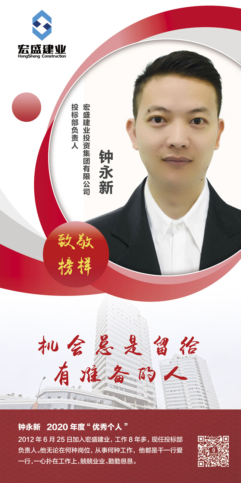人物小傳:鐘永新,生于1987年,廣東省南雄市人,2012年6月25日加入宏盛建業(yè),工作8年多,現(xiàn)任投標部負責人。