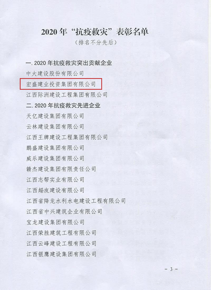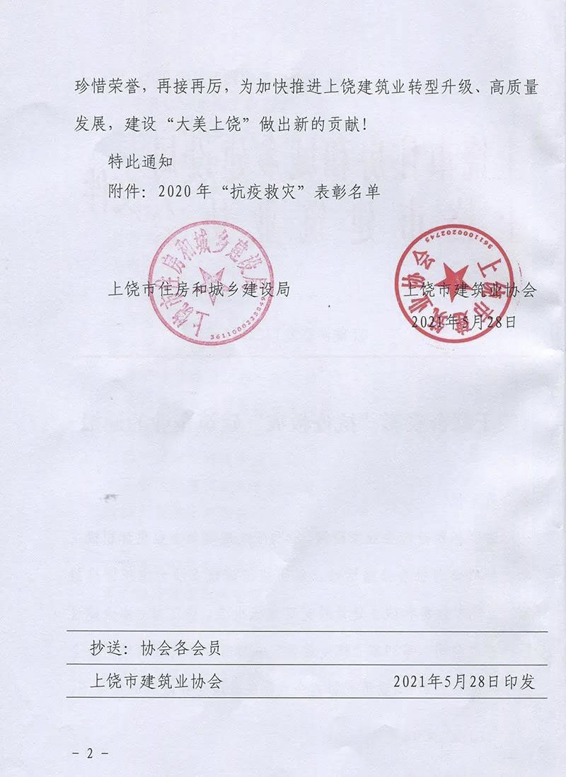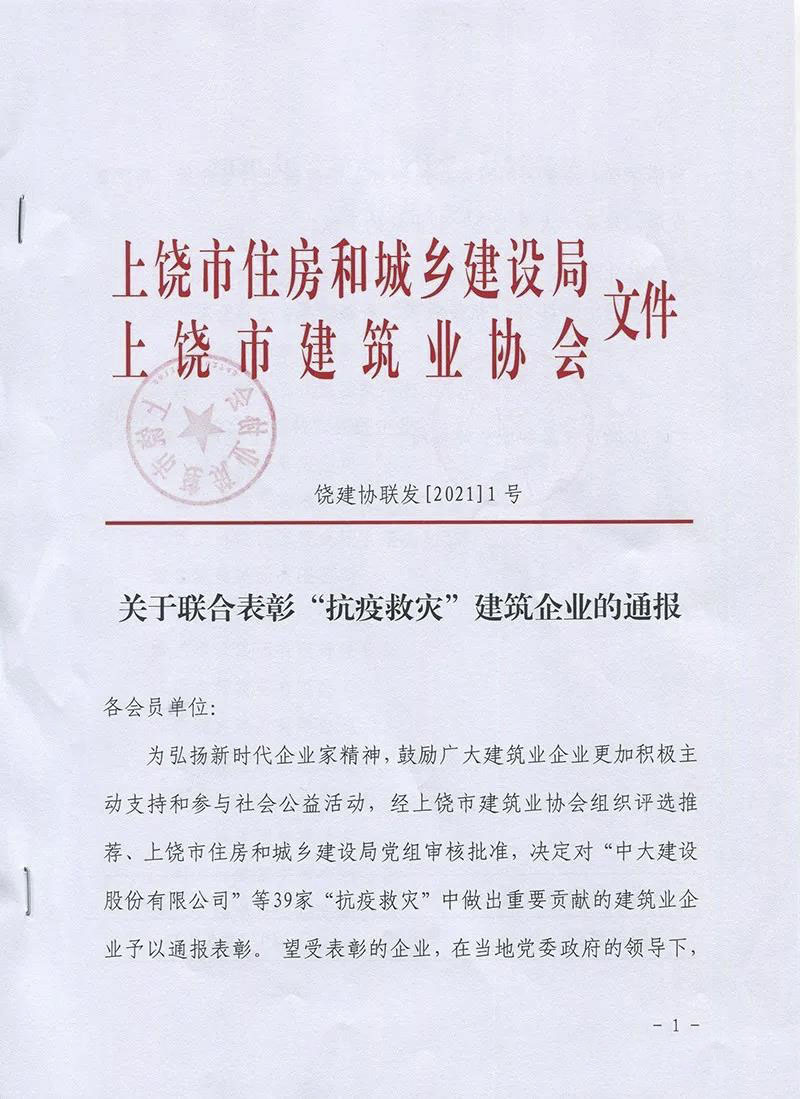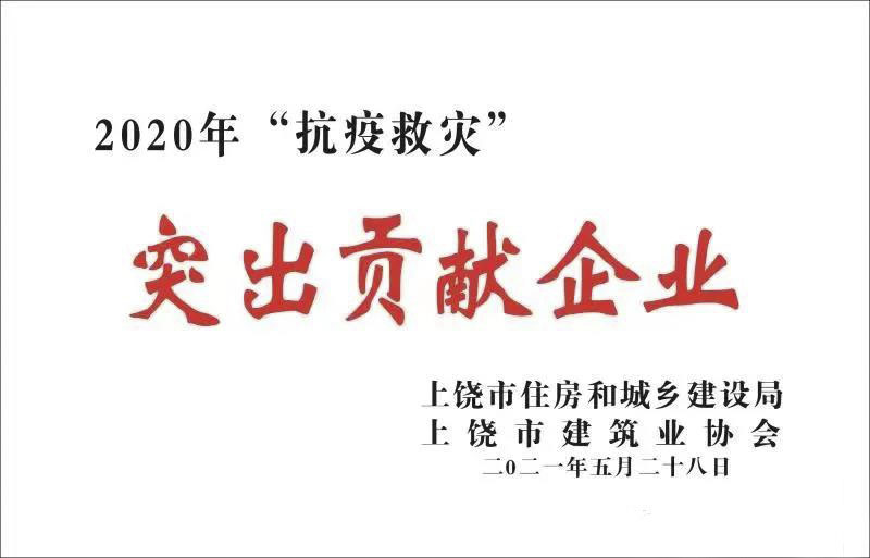 近日,經(jīng)上饒市建筑業(yè)協(xié)會組織評選推薦、上饒市住房和城鄉(xiāng)建設局黨組審核批準,對“抗疫救災“中作出重要貢獻的建筑企業(yè)予以通報表彰。集團獲評“2020年抗疫救災突出貢獻企業(yè)“!