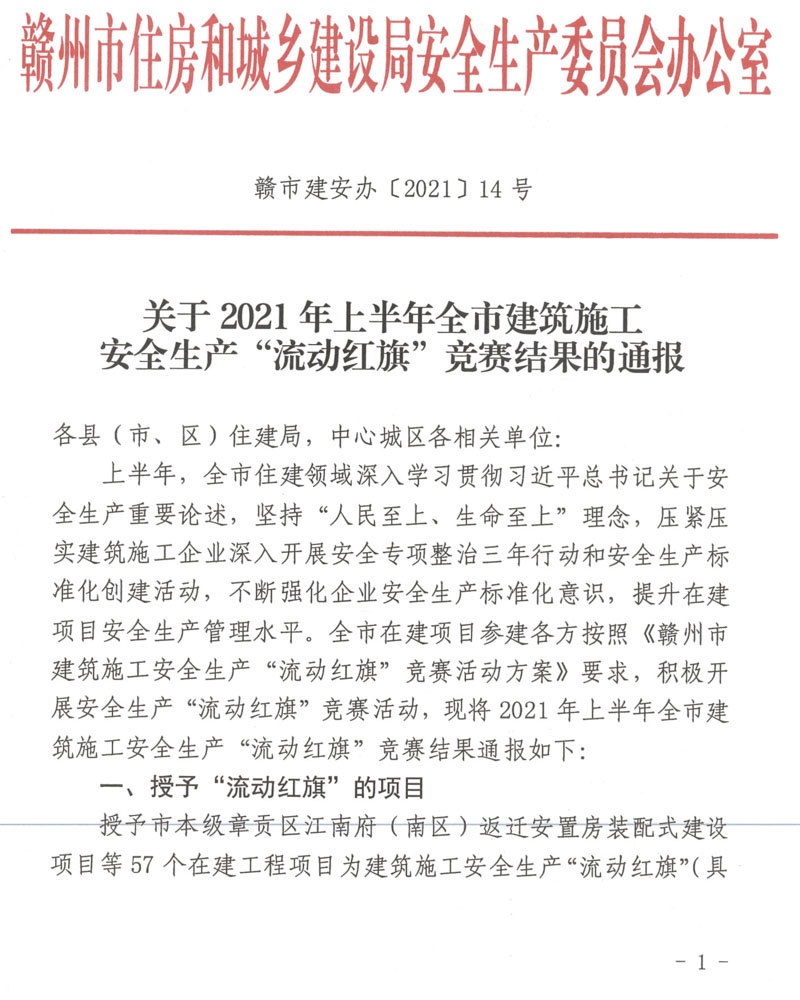 宏盛項目榮獲贛州市建筑施工安全生產(chǎn)“流動紅旗”獎項