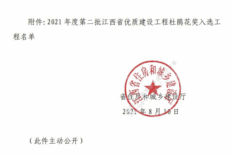 2021年8月10日,江西省住房和城鄉(xiāng)建設(shè)廳發(fā)布關(guān)于2021年度第二批江西省優(yōu)質(zhì)建設(shè)工程杜鵑花獎入選工程名單公告,宏盛建業(yè)投資集團房建工程項目——上饒市建筑科技產(chǎn)業(yè)園-總部經(jīng)濟園(地下室、2-4樓),榮獲“杜鵑花獎”。
