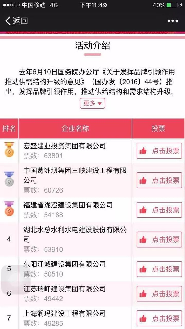 這次投票活動由百聯(lián)建筑網(wǎng)發(fā)起,從11月1日開始至7日結(jié)束。在為期一周的投票活動中,宏盛人團結(jié)一心,拼搏進取,勇爭第一,表現(xiàn)出強烈的責任感、榮譽感和過硬的戰(zhàn)斗力。在排名一度落后的情況下,大家紛紛行動起來,發(fā)動身邊親朋好友,通過微信群、朋友圈,廣泛號召,參與其中。從集團高管到各分、子公司、各自營項目負責人,大家?guī)ь^宣傳,積極投票,有的直到深夜還在關(guān)注投票進程。最后一天投票中,許多員工守到子夜時分,待投票活動結(jié)束才休息。