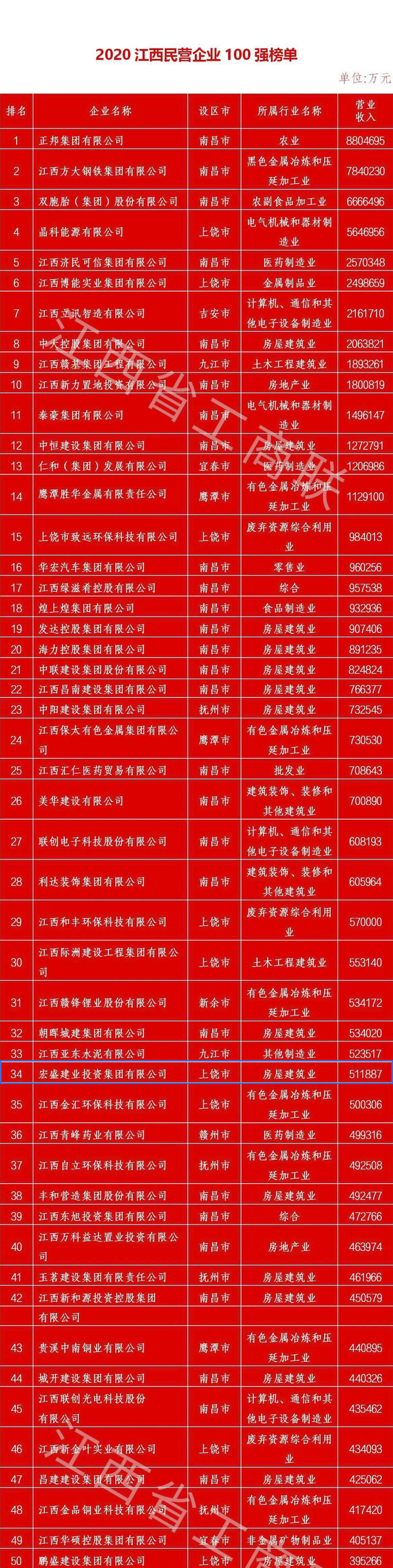 11月8號(hào)上午,由江西省工商聯(lián)主辦的“2020江西民營(yíng)企業(yè)百?gòu)?qiáng)峰會(huì)”在南昌濱江賓館舉行,峰會(huì)發(fā)布了2020年江西民營(yíng)企業(yè)100強(qiáng)榜單,宏盛建業(yè)集團(tuán)以 51.18 億元榮登第 34 位。據(jù)了解,今年江西百?gòu)?qiáng)民企的入圍門檻進(jìn)一步提高,達(dá)到 21.18 億元。集團(tuán)已連續(xù)多年位列其中。