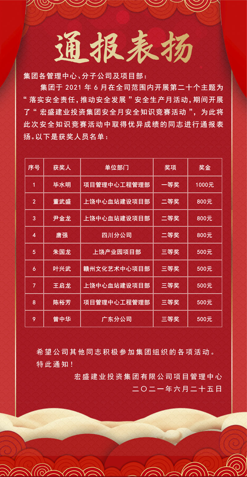 集團(tuán)于2021年6月在全司范圍內(nèi)開展第二十個(gè)主題為“落實(shí)安全責(zé)任,推動(dòng)安全發(fā)展”安全生產(chǎn)月活動(dòng),期間開展了“宏盛建業(yè)投資集團(tuán)安全月安全知識競賽活動(dòng)”,本次活動(dòng)有超過100位員工參加了在線考試,他們是集團(tuán)所屬所有項(xiàng)目管理人員,所有項(xiàng)目工程管理派駐人員,所有分公司工程部管理人員。員工們扎實(shí)的安全知識為他們?nèi)〉昧瞬诲e(cuò)的成績,對這些優(yōu)秀的員工公司也對他們進(jìn)行了獎(jiǎng)勵(lì)。
