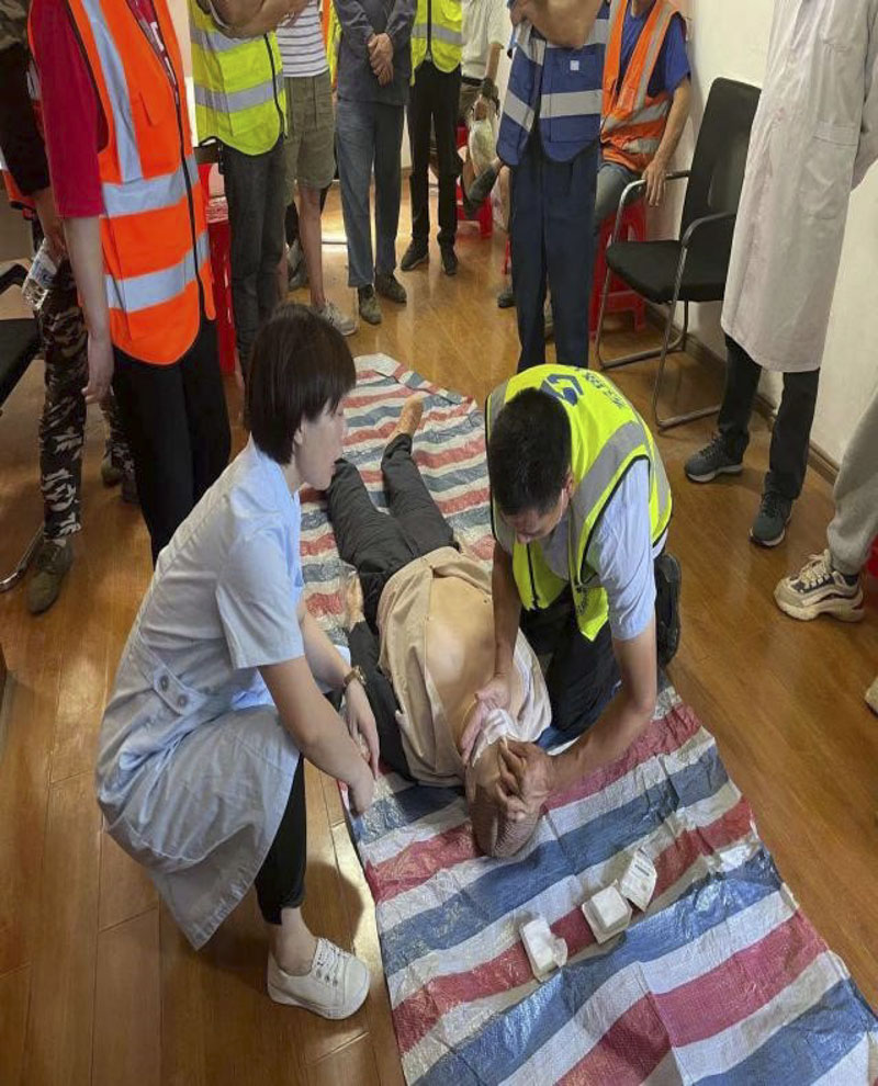 本次培訓分為理論學習和實際操作兩部分內(nèi)容,整個培訓過程中醫(yī)護人員詳細講解并演示了AED的操作方法、心肺復蘇的按壓頻率、按壓幅度、止血、固定、三角巾包扎等基本技能。