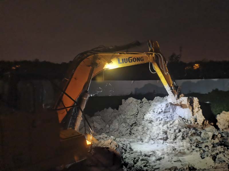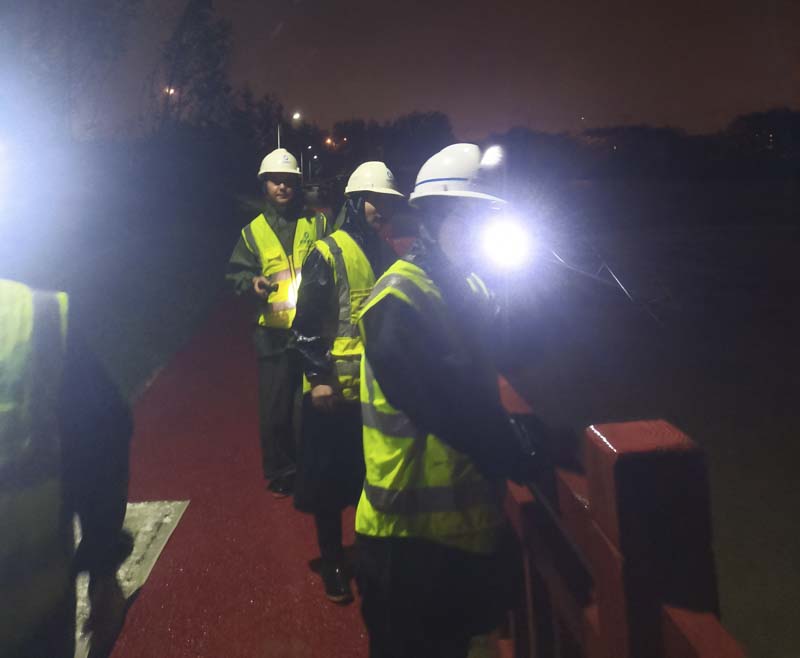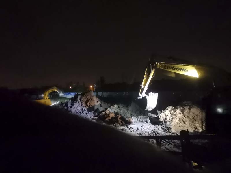 由于臨河水位的不斷上升,避免漲水淹沒(méi)我司做的地下工程,立馬調(diào)來(lái)三臺(tái)挖掘機(jī)和兩臺(tái)渣土車(chē)連夜工作,現(xiàn)場(chǎng)挖土加高項(xiàng)目南側(cè)的路面?,F(xiàn)場(chǎng)狂風(fēng)暴雨,搶險(xiǎn)支援隊(duì)的同事始終站在大雨中一絲不茍地指揮著。